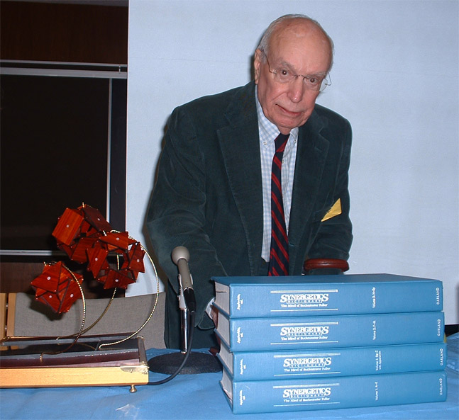 From energy in a ring to a revolution with polyhedra, the SNEC Symposium this spring was not only a tribute to Ed Applewhite, Bucky Fuller's collaborator on Synergetics, but also an opportunity to hear other Synergeticists discuss their work. Ed contributed to a panel discussion that started off the meeting talking about his life after leaving the CIA and devoting his time to compiling Fuller's notes and prodding and probing to collect the information that Fuller didn't have the time to organize. Ed delved into the way Fuller worked, no corrections, only additions, beginning with the holes and building on momentum. What we all probably enjoyed the best was Ed's insight into Fuller's inspirations: his own experiential mathematics, Kepler, Gauss, Coxeter, Von Bertalanffy, Poe; collaborators Duncan Stuart, Peter Pearce, Keith Critchlow, Ann Griswold Tyng, Ed Schlossberg, Joe Clinton and Olney Reamer. After Ed, Shoji Sadao talked about the architectural work. Bonnie DeVarco asked what had happened in the years between the failure of the Dymaxion House and the successes of the Dome. The only real clue was that Fuller was intent on learning from his failures. Kirby Urner expressed his optimism in the connections and modeling that computers will provide. John Belt paid his tribute poetically giving Ed a few primitive computer items with Fulleresque names. Bonnie DeVarco presented The Documentarian's Documentarian - A Tribute to E.J.Applewhite (Text) (MS Word). After Bonnie's tribute, Joe Clinton presented Ed with the first Cosmic Fishing Award (photo of Ed with the Cosmic Fishing Award and Synergetics Dictionary).